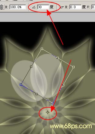 2.按ctrl + j把填充圖層復(fù)制一份按ctrl + t變形,把中心點(diǎn)移到圖片的下邊的中點(diǎn),角度的數(shù)值為30如圖2,然后確認(rèn),然后按ctrl + alt + shift + t不停的復(fù)制,直到形成一個(gè)圓,然后把這些圖層合并效果如圖3。