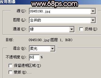 1.打開原圖按ctrl + j復制一層,執行菜單:圖像 > 應用圖像,參數設置如圖1