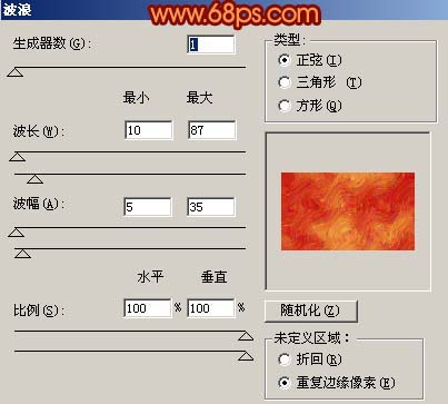 3.執(zhí)行菜單:濾鏡 > 扭曲 > 波浪,參數(shù)設(shè)置如圖4,效果如圖5