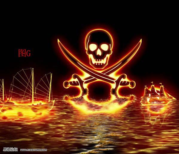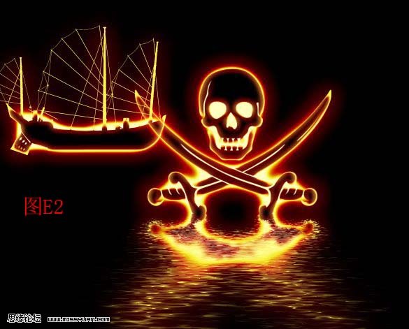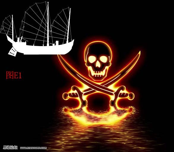 7.再新建一個圖層,用形狀工具畫一個海盜船,按ctrl + enter轉為選區(qū),填充為白色如圖e1,選中圖層1,按鼠標右鍵復制圖層樣式。再回到海盜船圖層,粘貼圖層樣式,效果如圖e2.
