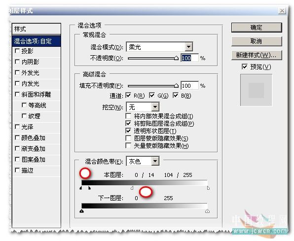 7.把圖層1,圖層模式改為柔光,需要更改一下圖層樣式的混合顏色帶,設(shè)置如圖