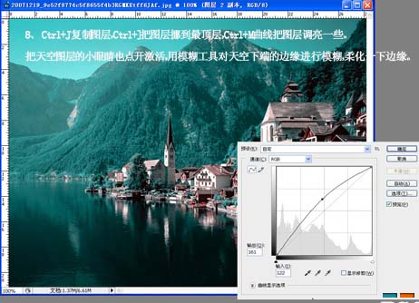 8.按ctrl + j復(fù)制圖層,按ctrl + ]把圖層移到頂層按ctrl + m調(diào)亮一點(diǎn)。把復(fù)制的天空圖層顯示出來,用模糊工具把天空下面的邊緣進(jìn)行模糊處理。