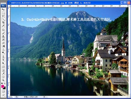 3.新建一個圖層按ctrl + alt + shift + e蓋印圖層,用魔術(shù)棒工具把天空部分選出來。