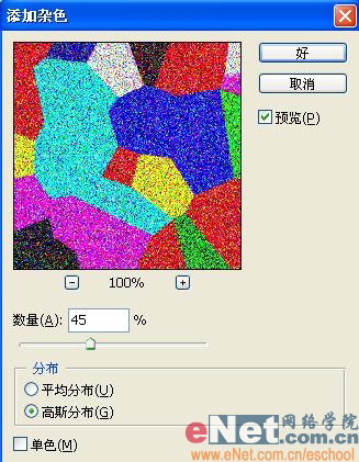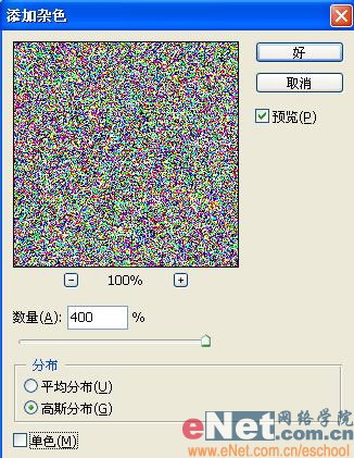2、執行菜單欄中的“濾鏡”“雜色”“添加雜色”命令,在彈出的對話框中設置參數如圖01所示,圖像效果如圖02所示。