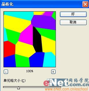 12、執行菜單欄中的“濾鏡”“像素化”“晶格化”命令,在彈出的對話框中設置參數如圖18所示,圖像效果如圖19所示。