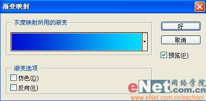 8、在圖層面板上單擊“創建新的填充調整圖層”按鈕,在彈出的快捷菜單中選擇“漸變映射”命令,在彈出的對話框中設置漸變顏色為深藍色到淺藍色,效果如圖11,12所示。