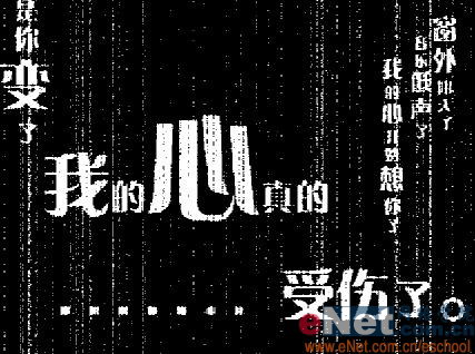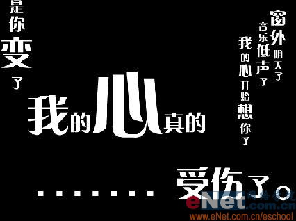 17、新建圖層3,并填充黑色,選擇工具箱中的文字工具,在窗口中輸入自己想輸入的各種大小的文字,效果如圖26所示。