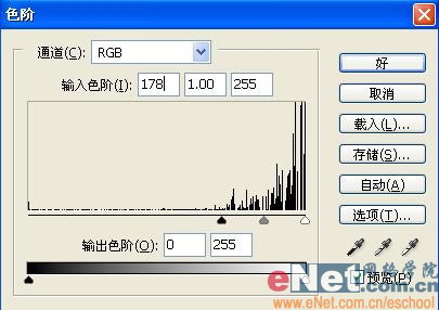 4、執行菜單欄中的“圖像”“調整”“色階”命令,在彈出的對話框中設置參數如圖05所示,圖像效果如圖06所示。