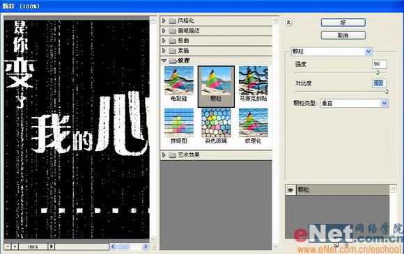 18、合并所有文字層與圖層3,執行菜單欄中的“濾鏡”“紋理”“顆粒”命令,在彈出的對話框中設置參數如圖27所示,圖像效果如圖28所示。
