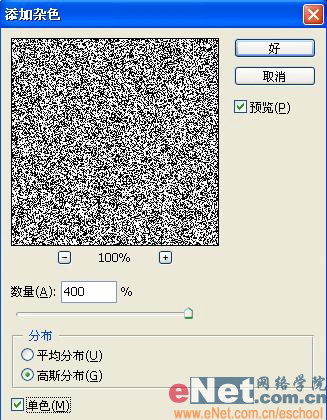 11、新建圖層2,放置圖層面板最上方,按alt+delete鍵填充白色,執行菜單欄中的“濾鏡”“雜色”“添加雜色”命令,在彈出的對話框中設置參數如圖16所示,圖像效果如圖17所示。