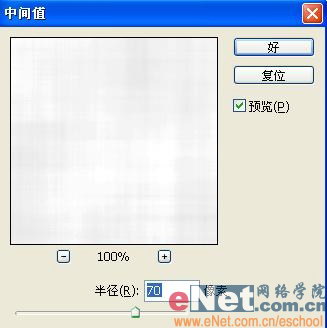 3、復制圖層1為圖層1副本,隱藏圖層1副本。選擇圖層1,執行菜單欄中的“濾鏡”“雜色”“中間值”命令,在彈出的對話框中設置參數如圖03所示,圖像效果如圖04所示。
