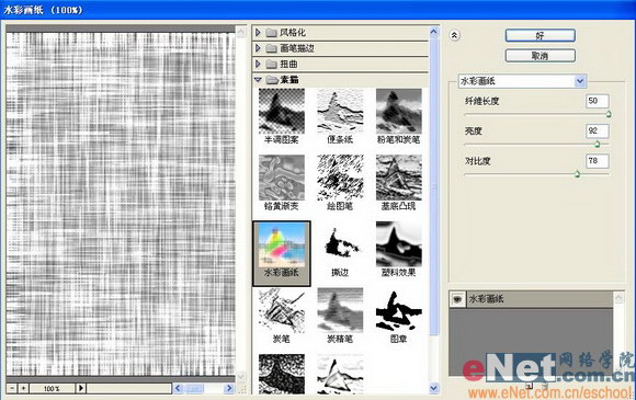 5、取消圖層1副本的隱藏,選擇該層,執行菜單欄中的“濾鏡”“素描”“水彩畫筆”命令,并在彈出的對話框中設置各項參數,如圖07所示,圖像效果如圖08所示。