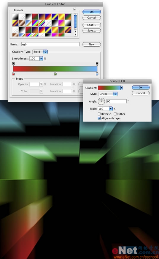 5.接著執行圖層-新建填充圖層-漸變。設置漸變色為紅,綠,青。之后將圖層混合模式設置為疊加,結果如下圖所示: