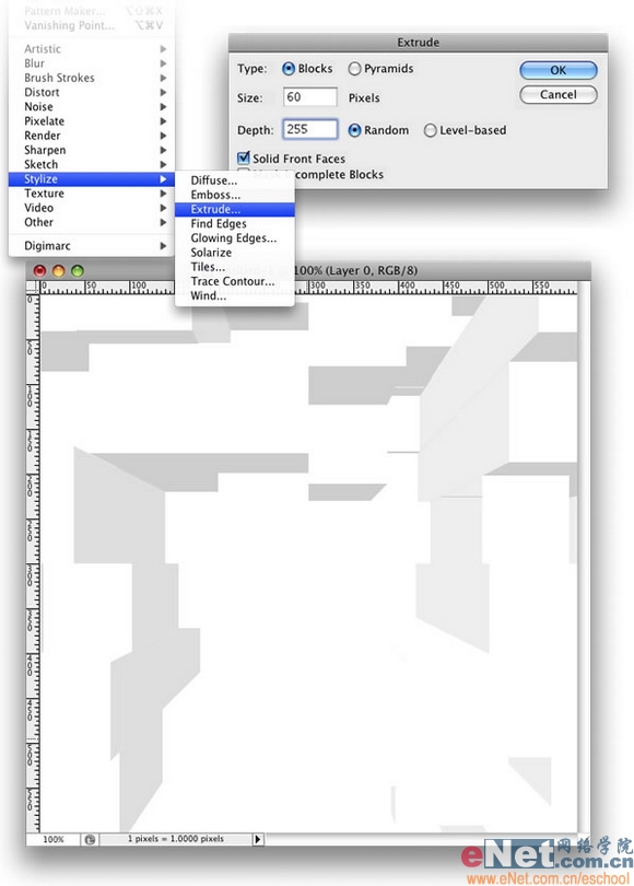1.建立一個新文檔,這里我用600*600像素。建立一個新圖層并用白色填充,命名為“blocks”。然后執行濾鏡-風格化-凸出,設置如下所示: