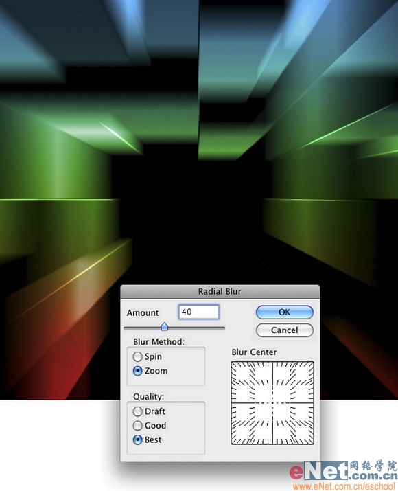 7.合并所有的直線圖層然后執行濾鏡-模糊-徑向模糊,設置數量為40,方法和質量分別設置為縮放和最好。設置如下圖所示: