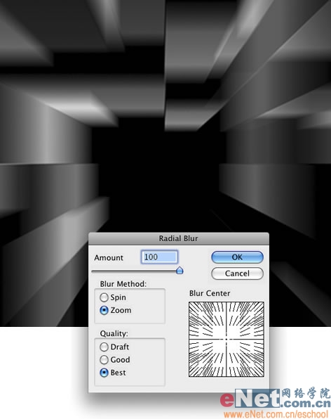 4.現在我們在來給它加入真實的3維空間效果。執行濾鏡-模糊-徑向模糊。設置數量為100,方法和質量分別設置為縮放和最好。結果如下圖所示: