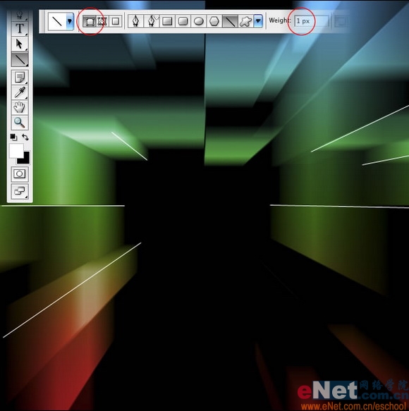 6.在漸變填充層上建立一個新圖層組,命名為“lights”。然后選擇線性工具并設置線條的顏色為白色。然后在立方體的邊緣處創建直線,結果如下圖所示: