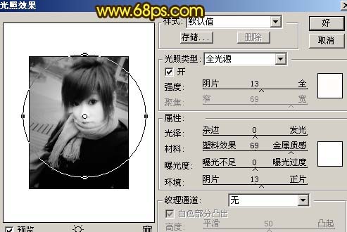 3、新建一個圖層按ctrl + alt + shift + e蓋印圖層,執行菜單:濾鏡 > 渲染 > 光照效果,參數設置如圖2,效果如圖3。
