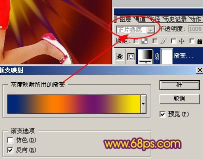 4、創建漸變影射調整圖層,參數設置如圖6,確定后把圖層混合模式改為“正片疊底”,效果如圖7。