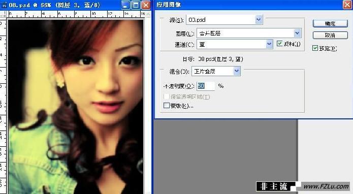 5、選中藍(lán)色通道,圖像-應(yīng)用圖像,設(shè)置如圖