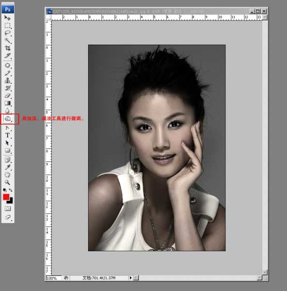 5.此時,圖片已初有端倪,下面再進行圖片的調整。其中包括圖章工具的磨皮,加深減淡工具的運用。