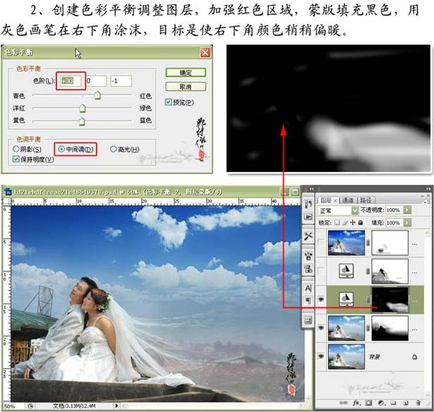 2、創建色彩平衡調整圖層,加強紅色區域,蒙版填充黑色,用灰色畫筆在右下角涂抹。