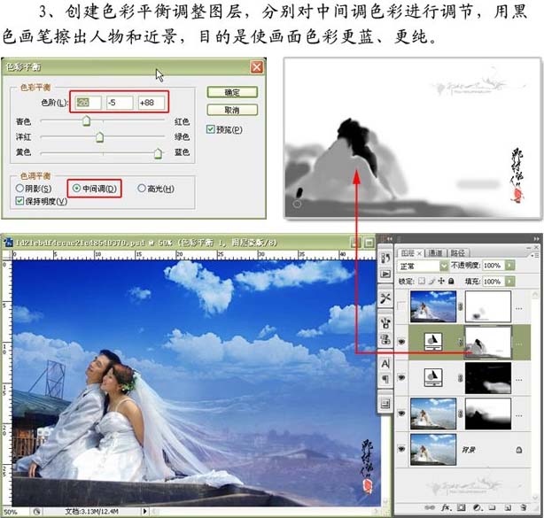 3、創建色彩平衡調整圖層,分別對中間色彩進行調整,用黑色畫筆擦出人物和近景,木的是使畫面色彩更藍、更純。
