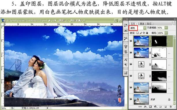 5、蓋印圖層,圖層混合模式改為“濾色”,降低圖層不透明度,按alt鍵添加圖層蒙版,用白色畫筆把人物皮膚提出來,目的是增亮人物皮膚。