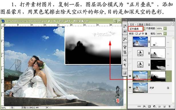 1、打開素材圖片,復制一層,圖層混合模式改為“正片疊底”,添加圖層蒙版,用黑色畫筆擦出除天空以為的部分。