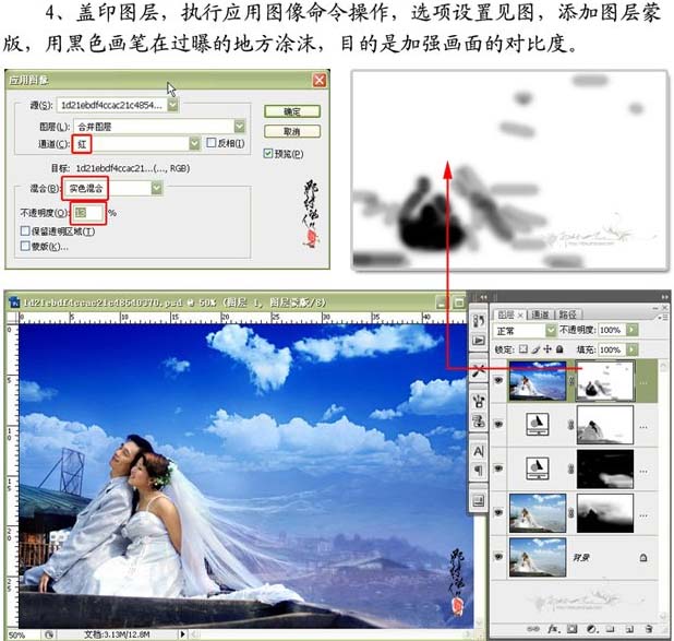 4、蓋印圖層,執行應用圖象命令操作,選項設置如下圖,添加圖層蒙版,用黑色畫筆在過暴的地方吐沫。