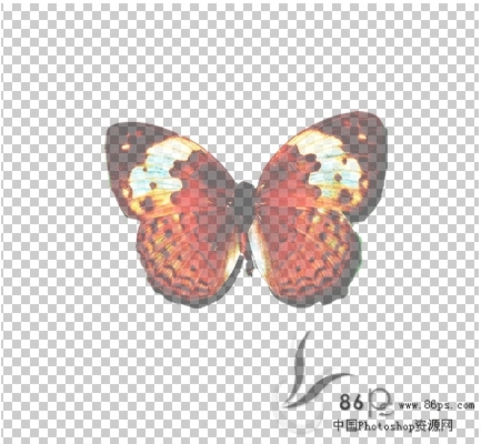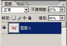 8、打開一副蝴蝶或其它你喜歡的昆蟲圖片,雙擊背景層將其變成圖層0,用索套工具將蝴蝶選出,反選,del刪除背景,ctrl+d取消選區,把圖層0的不透明度調到87%,填充調到90%