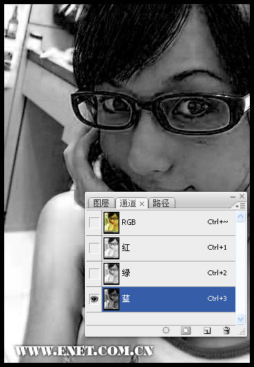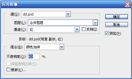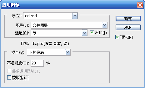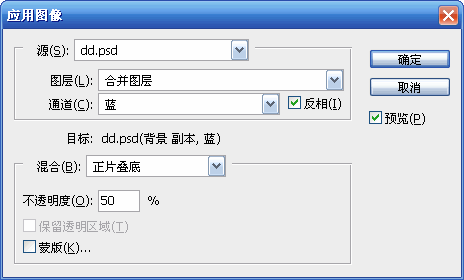 先做反轉(zhuǎn)負(fù)沖效果,點擊藍(lán)色通道,“圖像”--“應(yīng)用圖像”,設(shè)置參數(shù)如圖