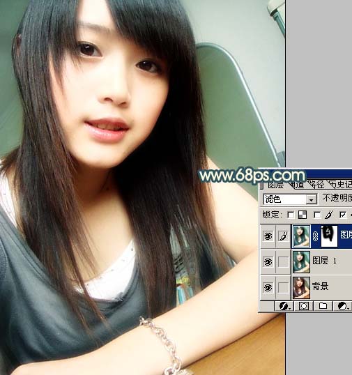2、按ctrl + j把調(diào)好色的圖層復(fù)制一份,圖層混合模式改為“濾色”,圖層不透明度改為:30%,然后加上圖層蒙版用黑色畫筆把人物部分擦出來,效果及圖層對照如圖2。