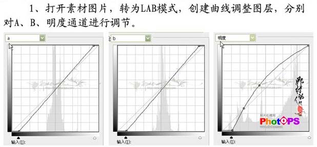 1、打開素材圖片,選擇菜單:圖像 > 模式 > lab模式。創建曲線調整圖層,分別對a,b,明度通道進行調整參數設置如下圖。