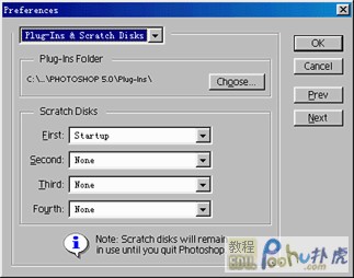 最后還有一個大家最容易忽視的問題,那就是如果安裝的濾鏡過多,會影響photoshop的執行效率,處理圖像時速度會變得很慢。為了解決這個問題,photoshop中使用的濾鏡還能放在其他的目錄里面,改變目錄的方法是:執行file/preferences/plug-ins & scratch disks命令,彈出濾鏡屬性對話框(如圖);