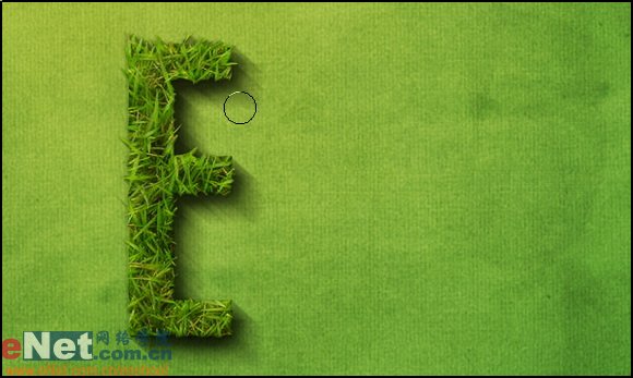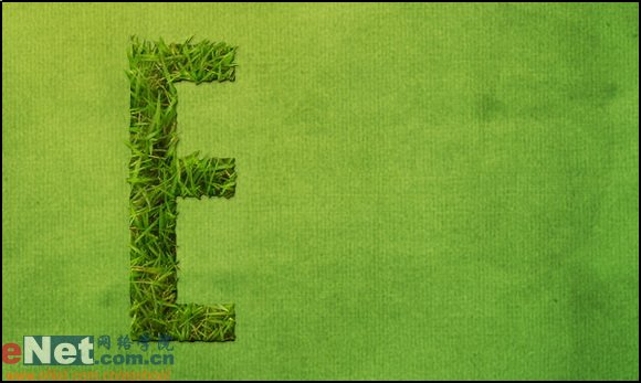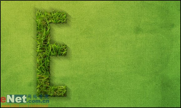 11.將制作完畢的路徑按ctrl+enter轉換成選區并回到草地層上按ctrl+j將其復制出來。我們先來看下最先完成的字母“e”置于背景之后的效果。顯然這看下去是不太盡如人意的。它的立體感還不夠強。如下圖所示: