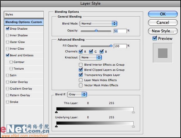 12.雙擊“e”字母層加入圖層樣式設置斜面與浮雕和光澤圖層樣式,如下圖所示: