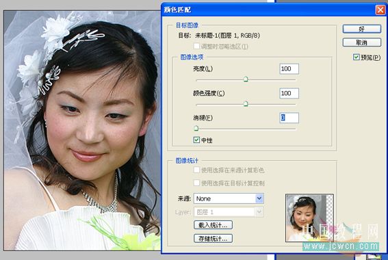 1、打開文件后按ctrl+j,復制圖層,得到圖層1,在圖層1上執行:圖像----調整----顏色匹配,選中間處的中性。