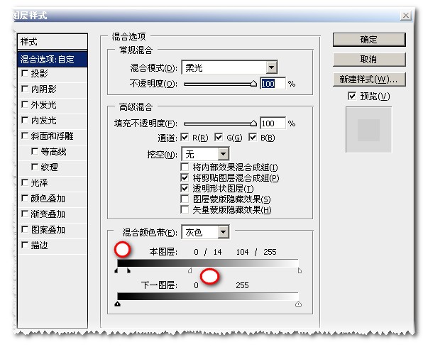 8.把圖層1,圖層模式改為柔光,需要更改一下圖層樣式的混合顏色帶,鍵盤按著alt鍵,鼠標拉動分離這個,設置如圖