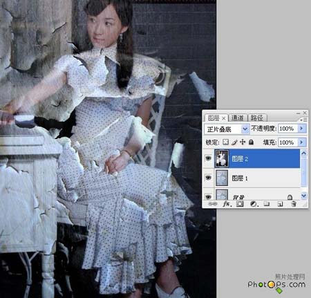 本photoshop教程介紹簡單的利用素材合成墻壁上剝落的舊畫。制作過程比較簡單:先把素材圖片都放到同一個文件里面,改變圖層的混合模式,調整下色彩,讓照片更舊,然后把一些有缺口的地方的圖片刪除即可。