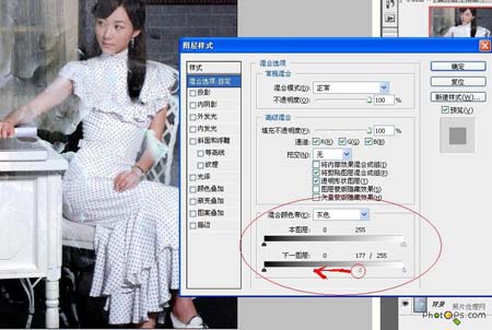 2、雙擊人物圖層,調出圖層樣式對話框,在混合顏色帶設置如下圖(按住alt鍵即可分開拉動三角塊)。