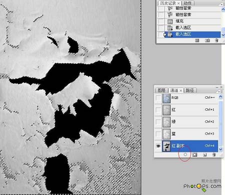 7、載入紅副本通道的選區,如下圖(點擊下面用紅圈所指的圖標),按住ctrl單擊該通道。