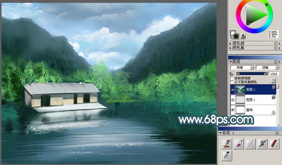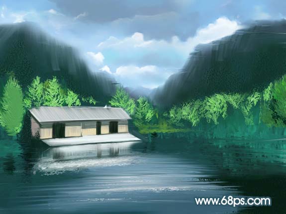 3、這里我選用載色刮刀結合數碼板的壓感繪制的房屋。然后轉成薄刮刀融和畫面的顏色,尤其是水面。還是印象派 ...