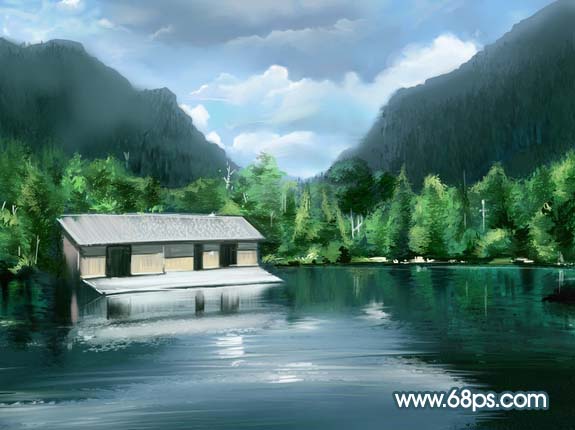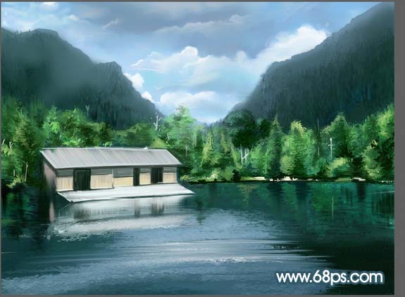 5、刻畫遠山。注意因空氣所導致的景物遠近虛實及顏色的變化。為樹木添加中間色。