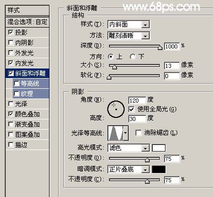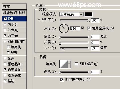 5、雙擊圖層調出圖層樣式,參數設置如圖10-13,效果如圖14。