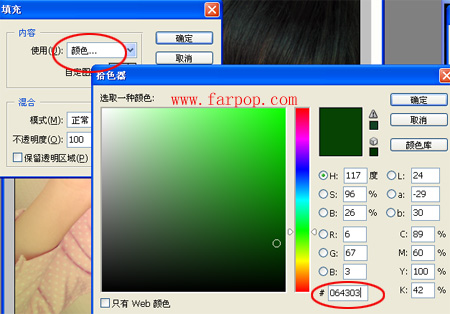 2、新建一個圖層,選擇菜單,編輯-填充-顏色#064303;