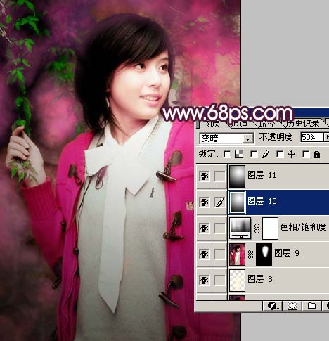 7、新建一個圖層,選擇漸變工具,顏色設置為黑白漸變,然后繪制徑向漸變,確定后把圖層混合模式改為“變暗”,圖層不透明度改為:50%,然后把漸變圖層再復制一層,圖層混合模式改為“柔光”,圖層不透明度改為:50%,圖層參考及效果如圖10。
