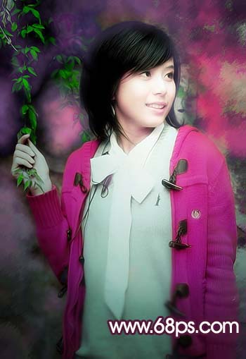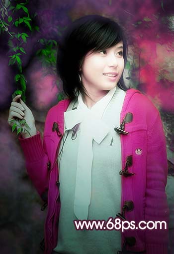 5、新建一個圖層,按ctrl + alt + shift + e蓋印圖層,把前景色設置為:#f462a8,背景顏色設置為黑色,執行菜單:濾鏡 > 渲染 > 分層云彩,確定后加上圖層蒙版把人物部分擦出來,效果如圖8。