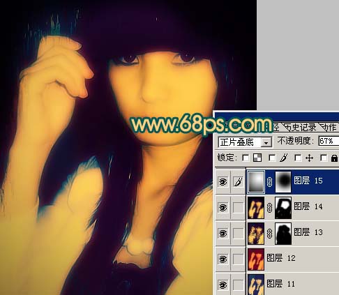 7、新建一個圖層,選擇漸變工具,顏色設置為黑白漸變,然后繪制徑向漸變,確定后把圖層混合模式改為“正片疊底”,圖層不透明度改為67%,再加上圖層蒙版把人物部分擦出來。圖層參數及效果如圖9。