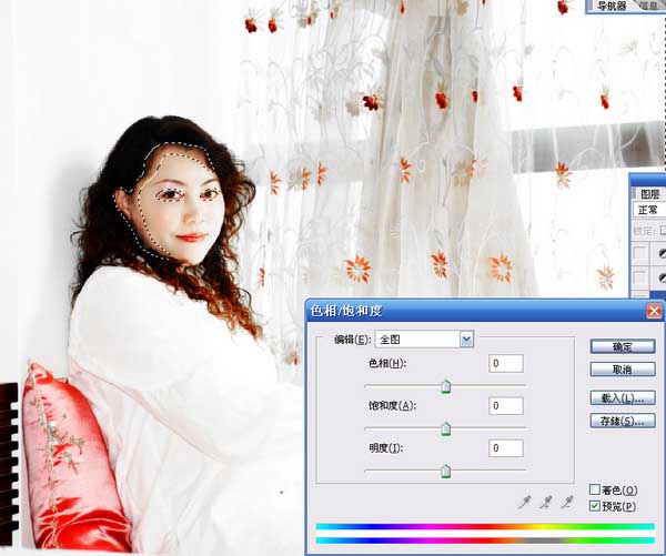 第五步 先用套索工具圈選出發際線和眼睛部位(因為這些部位經過色相調整容易失真),羽化像素根據實際情況設置為5-7左右,創建色相飽和度調整圖層,選區部分會顯示出圖層蒙板,